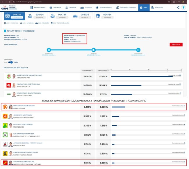 En el video se menciona la mesa de sufragio 004734, ubicada en la provincia de Andahuaylas, región Apurímac, y se indica que, tras la digitalización de los votos, los resultados fueron manipulados. Según se relata, Perú Libre registraba 180 votos frente a 28 de Fuerza Popular en el acta electoral, pero estas cifras habrían sido invertidas en el sistema.