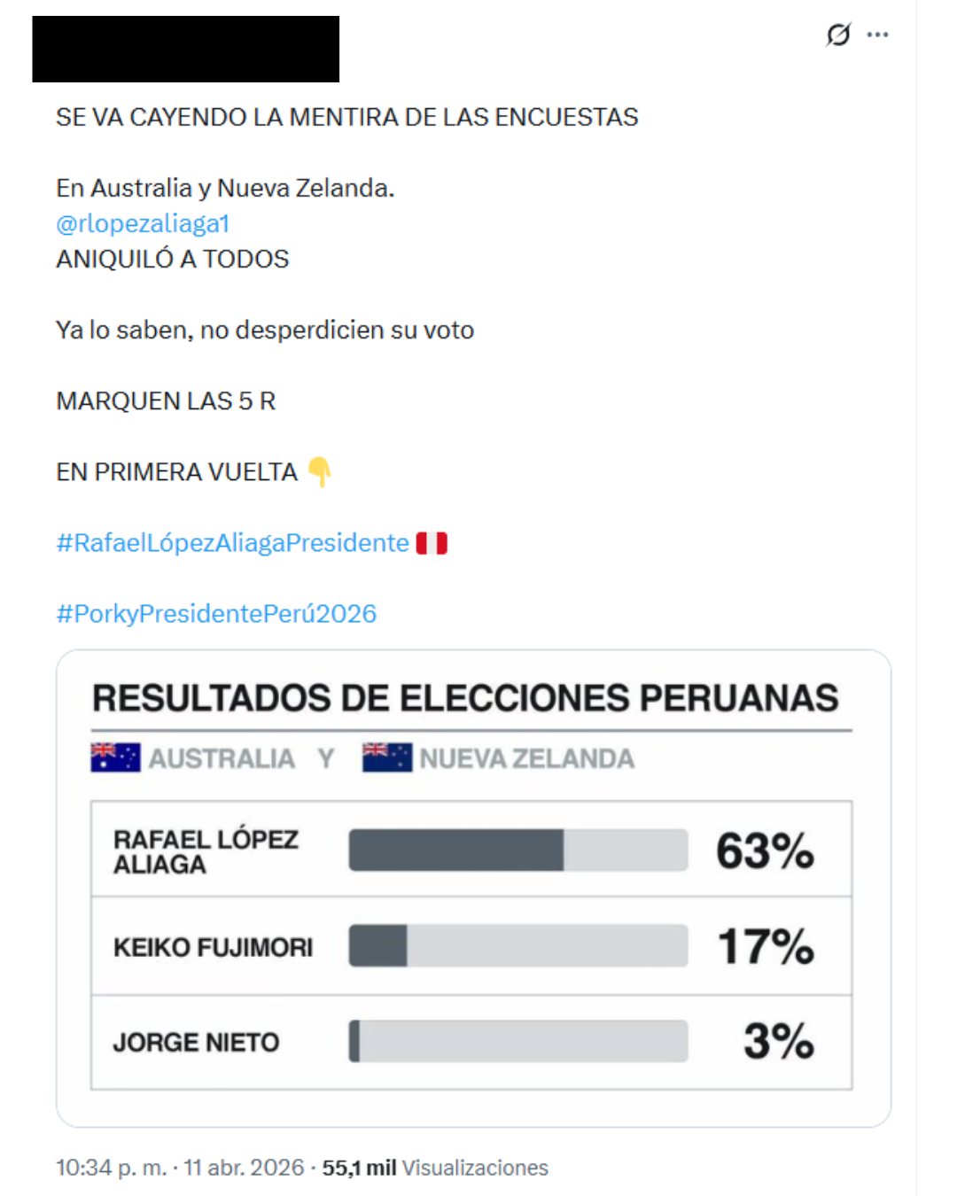 El 11 de abril de 2026 comenzó a circular en redes sociales una imagen con el mensaje: “Se va cayendo la mentira de las encuestas. En Australia y Nueva Zelanda, López Aliaga aniquiló a todos”. La publicación muestra porcentajes de votación en los que el candidato de Renovación Popular aparece con 63%, seguido por Keiko Fujimori con 17% y Jorge Nieto con 3%.