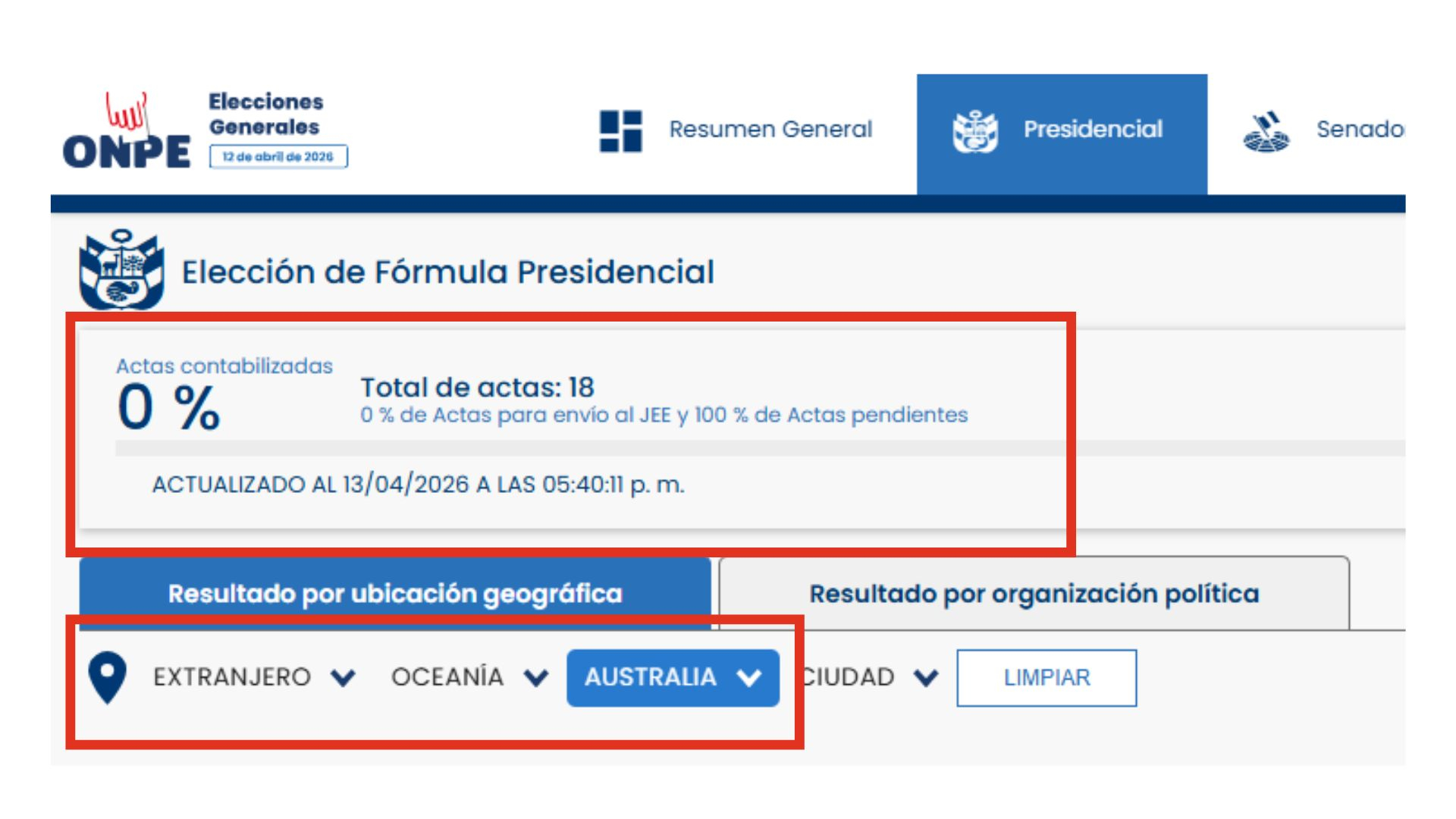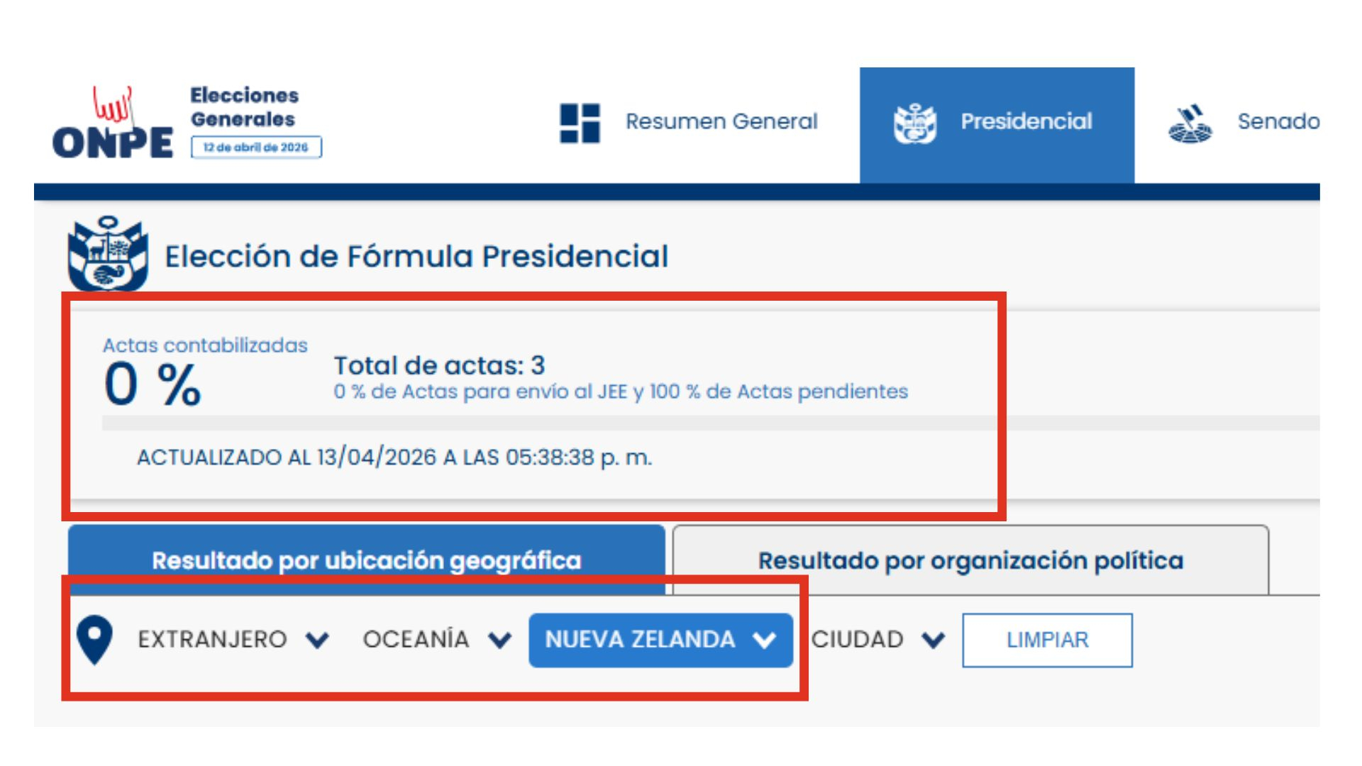En comunicación con PerúCheck, la ONPE confirmó que, hasta el cierre de esta nota, las actas de Nueva Zelanda y Australia aún no habían sido procesadas, por lo que no figuraban en el portal web.