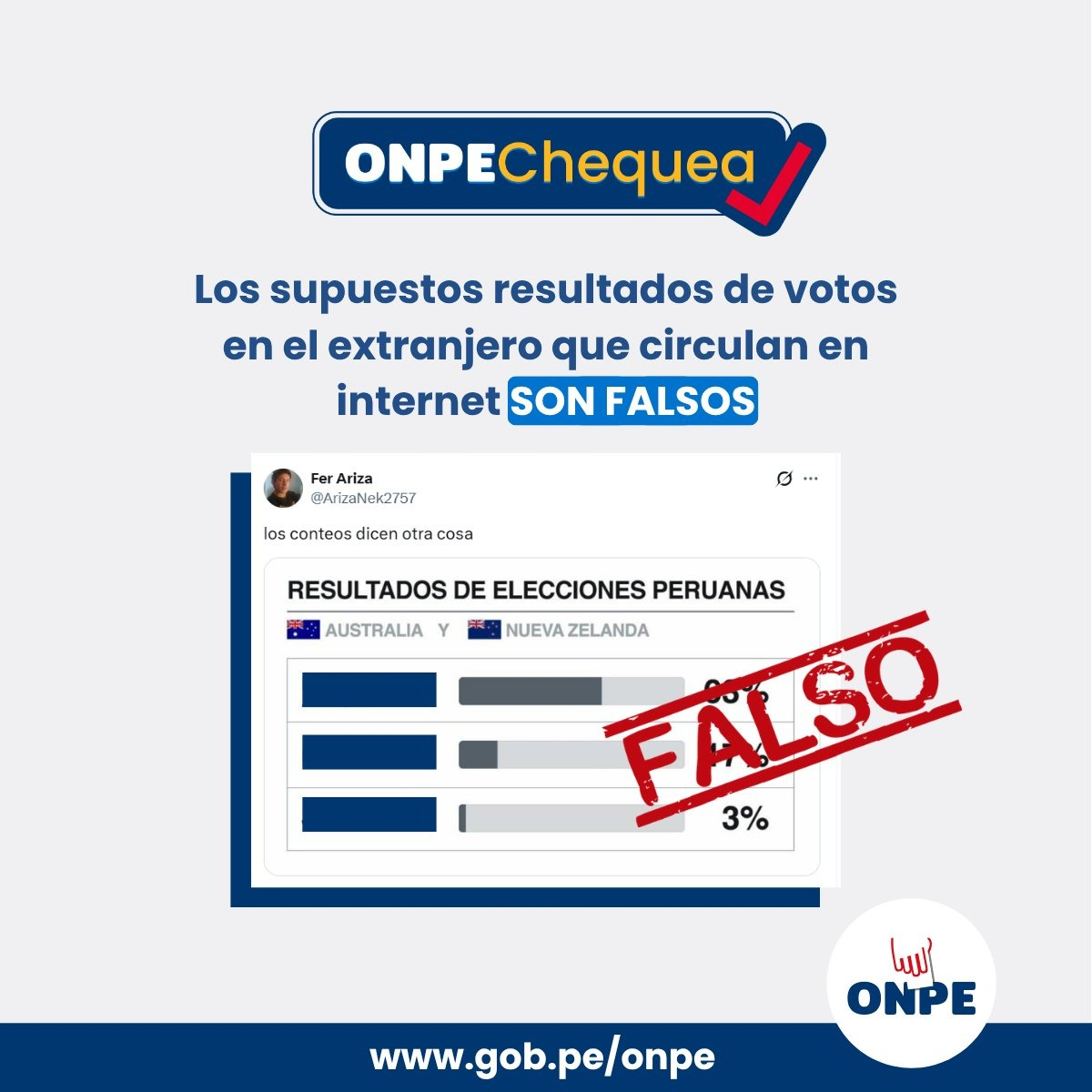 La Oficina Nacional de Procesos Electorales (ONPE) desmintió el supuesto conteo de votos en Nueva Zelanda y Australia a través de sus canales oficiales. “Los supuestos resultados de los votos en el extranjero que circulan en redes sociales, en el marco de las Elecciones Generales 2026, son falsos”, señaló la entidad.
