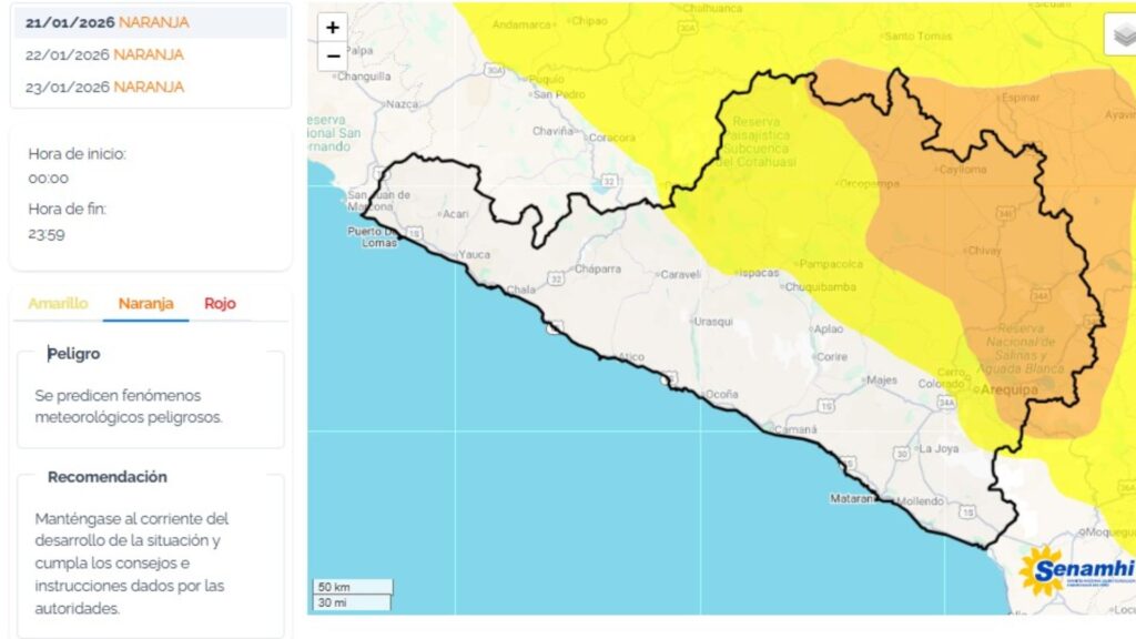 Ante esta situación, el Servicio Nacional de Meteorología e Hidrología del Perú (Senamhi) emitió una alerta meteorológica de nivel naranja para la sierra de Arequipa, advirtiendo sobre la probabilidad de fenómenos peligrosos que ponen en riesgo a varios distritos.